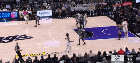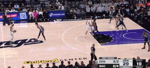 掘金的传统高位三人进攻组合,这一次是约翰逊借约基奇的无球掩护提上和穆雷打一个give&go,随后穆雷和约翰逊约基奇打stagger掩护,从而摆脱对位的基根穆雷,穆雷倚住对手稳稳打板命中投篮。